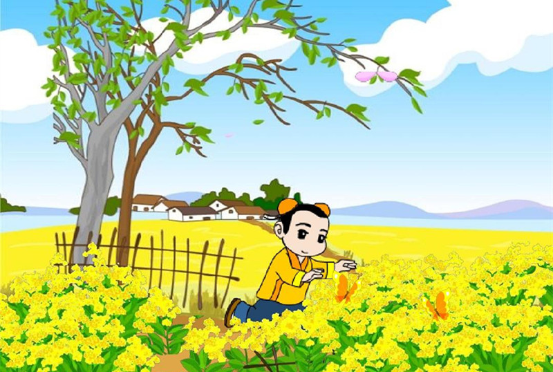 赏析:树枝头上的落花在微风中,纷纷掉到了插着稀稀疏疏竹篱笆的小路上。黄色的小蝴蝶在儿童的追赶下,忽闪忽闪地飞进了黄色油菜花,了无踪迹。小孩子的童趣跃然纸上。
